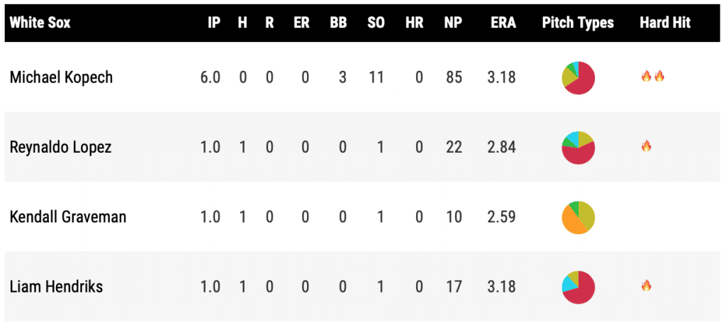 For the first time since injuring his knee a few months ago, Kopech looked utterly dominant on the mound. He had control of all of his pitches, had some late velo and movement deep into the game, and other different conditions, could have likely gone another inning or two in this one.