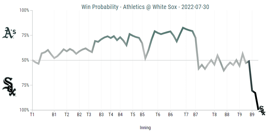 Johnny Cueto took the mound for the White Sox and was Mr. Reliable once again, pitching seven innings for the fifth time in five tries in his career against the Athletics. His only two blemishes were solo home runs given up in the first and third innings, but beyond that, he worked seven strong innings. He was followed by Jimmy Lambert and Liam Hendriks, both of whom were able to work around a little bit of traffic on the basepaths to keep the Athletics at two runs while the offense tried to scrape across the necessary third run.
