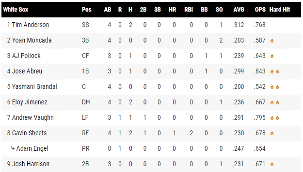 The offense was led by Gavin Sheets, whose two-run homer in the bottom of the seventh tied the game up for the White Sox and ensured Cueto could not be the loser in a brilliant outing. He was the key to the victory as well, as his ninth-inning leadoff double would be the run that eventually scored for the White Sox on the walk-off wild pitch with Tim Anderson at the plate. Sheets, Jimenez, and Anderson both turned in two-hit nights, with Moncada, Grandal, and Harrison being the three regulars who did not have a hit in the effort.