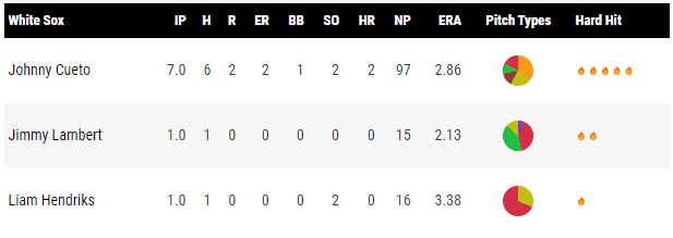 Cueto battled his control early in this game, but really settled in during the middle innings and worked into the seventh inning once again for the White Sox. Cueto lowered his ERA to 2.86 in the effort, and once again, proved to be Mr. Reliable when it comes to what he gives you on the mound.