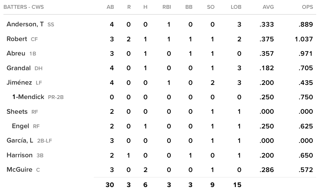 - Bottom 8th: Jimenez grounded into fielder’s choice to shortstop, Robert scored, Abreu out at second