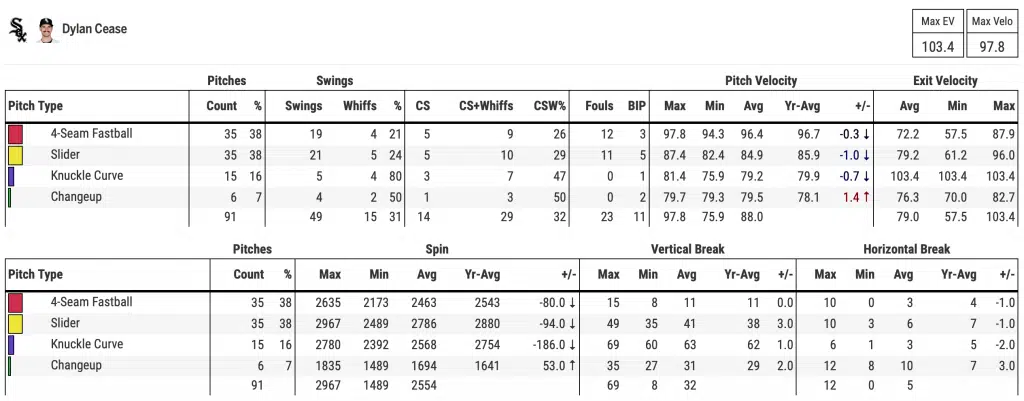 Dylan Cease: 5.2 IP, 3 H, 1 ER, 2 BB, 8 K, 15 Swinging Strikes