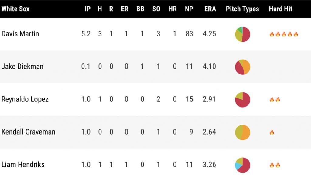 Martin worked five and two-thirds innings and this one, once again giving the Sox a chance to win. Jake Diekman continued to be outstanding. He came on after Davis Martin and recorded one strikeout for the last out in the sixth inning. Reynaldo Lopez made his return from the IL with one inning of scoreless baseball. Kendall Graveman worked a clean eighth inning, and Liam Hendriks came on to shut the door. He did give up one run after a single and a couple wild pitches, making the third run in this one all the more important.