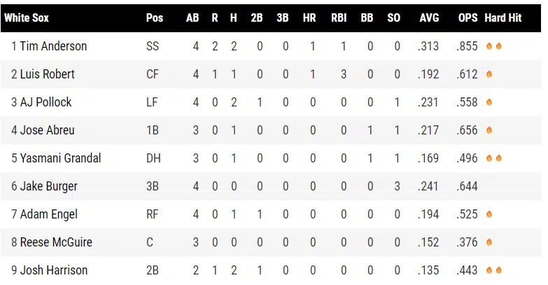 Robert is still getting back into the groove after missing several games with a groin injury, but today was a nice place to start. He hammered a Suarez offering to right center field – a place he often hits when he’s at his best. Look for Robert to refine his pitch selection and drive the ball more consistently as he gets more comfortable at the plate again.