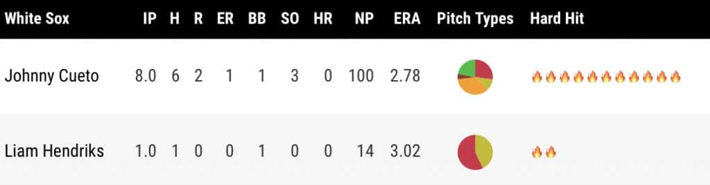 Cueto was nails today and took another ballgame into the late innings. He kept the Sox in the game after a tough first inning, only needing 100 pitches to get through eight innings. Cueto’s fourteen quality starts are his most since 2016.