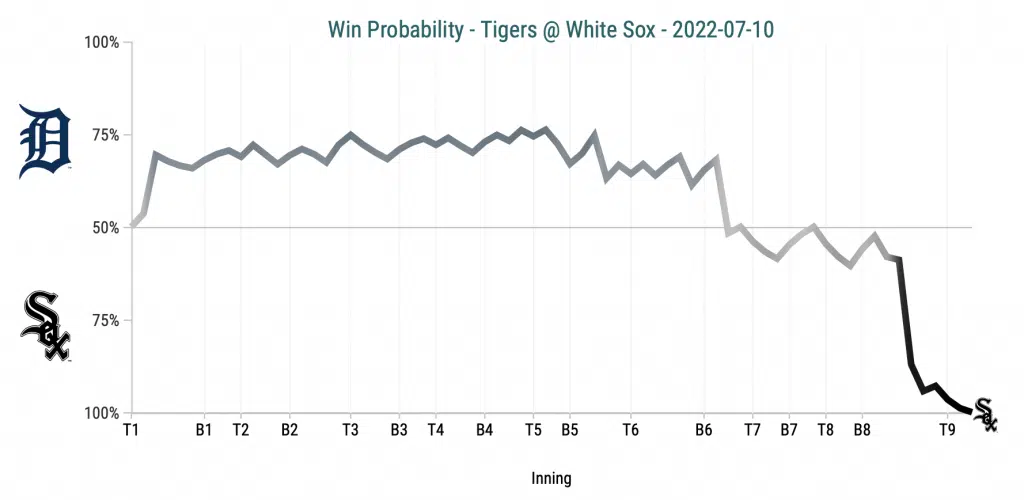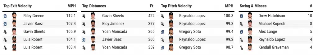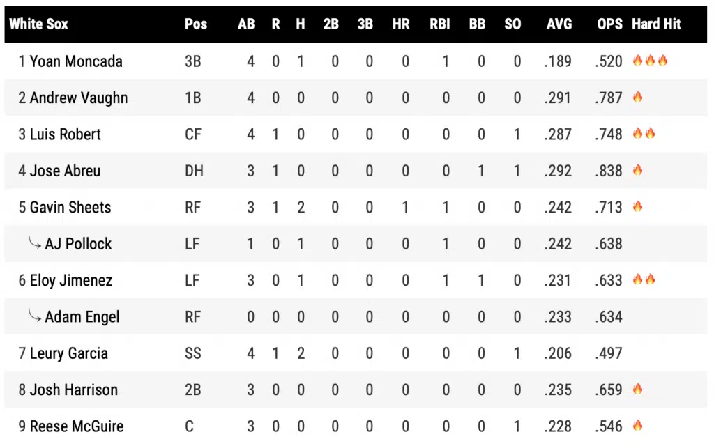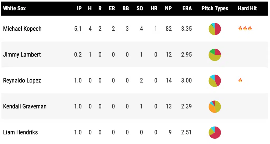Michael Kopech got the start on the mound today, and once again, battled fastball ineffectiveness. He threw five straight fastballs out of the zone to start the game before giving up a two-run homer to Javier Baez that put the Tigers up 2-0 early. His fastball averaged about 92 mph, well below his season average. After the homer, however, he battled to throw 5.1 innings to get the White Sox deeper into this one with a chance to strike. He was followed by scoreless outings by Jimmy Lambert, Reynaldo Lopez, Kendall Graveman, and Liam Hendriks that would allow the offense a chance to get the team back into it.