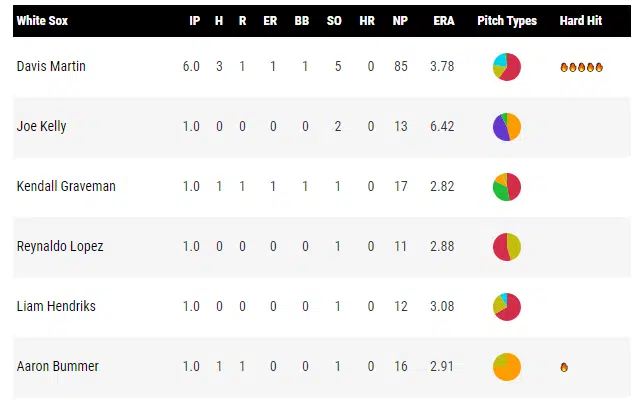 The day started off rough for Chicago with Michael Kopech being placed on the 15-day IL, and Johnny Cueto‘s start tonight was scratched due to illness. Davis Martin was recalled from Charlotte and pitched quite well to help keep the White Sox afloat for the game. In 6.0 IP, Martin allowed only one run in 85 pitches. Martin was followed by a lights out Joe Kelly in the 7th. However, Kendall Graveman allowed a run to score in the 8th inning, which tied the game. Reynaldo Lopez pitched a scoreless 9th, and into extra innings we went. Liam Hendriks worked out of an early jam in the bottom of the 10th and ultimately did not allow a run to score. After the White Sox scored two runs in the top of the 11th, Aaron Bummer converted his second save of the season.