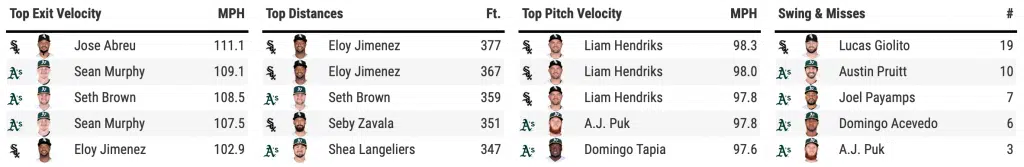 W: Aaron Bummer (2-1) | L: A.J. Puk (3-2) | S: Liam Hendriks (32)