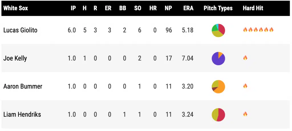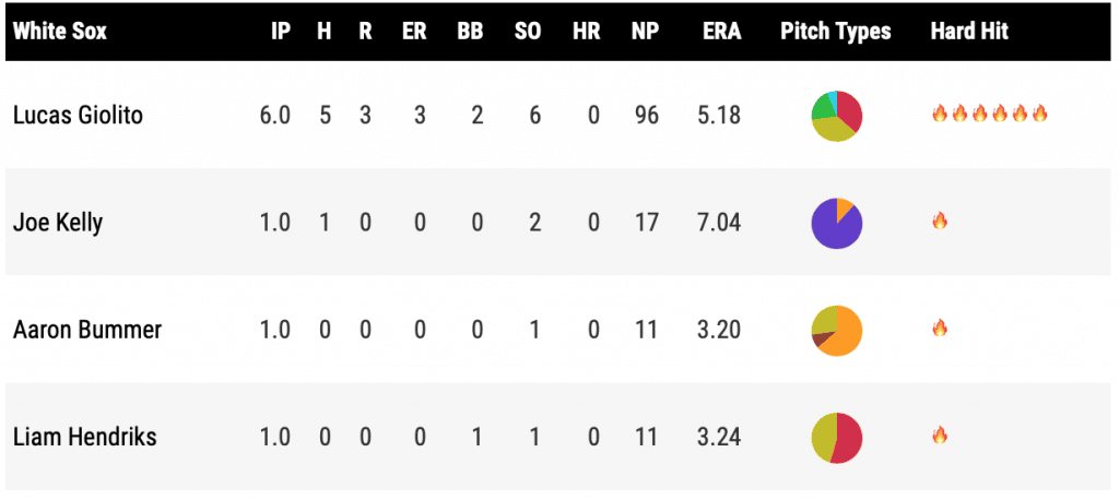 It wasn’t the best night of Giolito’s career, but I’m sure he will tell you he’s pretty happy with a quality start in a season that hasn’t been filled with too many of those. The changeup looked the best it has in awhile, and with the quality start, he did his job in this one.