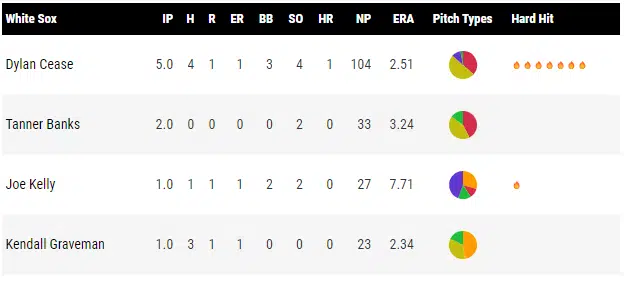 Cease wasn’t his sharpest in this game, and he had to work around traffic on the basepaths in all five innings. However, he consistently shut down rallies and kept the White Sox in the game until the offense could provide the extra runs necessary. Cease lowered his ERA to 2.51 on the season after this start.
