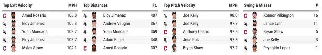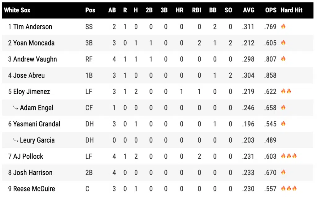 Other standouts include Yoan Moncada and Eloy Jimenez, who were responsible for the first three runs of the game for the Sox (Moncada RBI BB, RBI 2B, Jimenez HR).