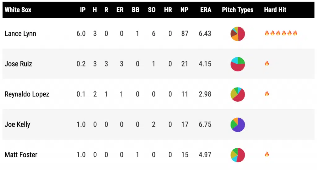 Lance Lynn got the start in game two and looked much closer to the Lynn we’ve gotten to know throughout his tenure on the South Side. His fastball looked a lot better, amassing a 45% Whiff Rate on the pitch throughout the night. He completed six scoreless innings and looked to be prepared to get himself a win after leaving the game with a 3-0 lead.