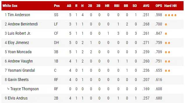 On the offensive side, the White Sox hammered out 15 hits, including a four-hit night by Tim Anderson at the top of the lineup. Anderson, Eloy Jimenez, Yoan Moncada, and Andrew Vaughn all turned in multi-hit games, with Robert leaving the yard on the evening.