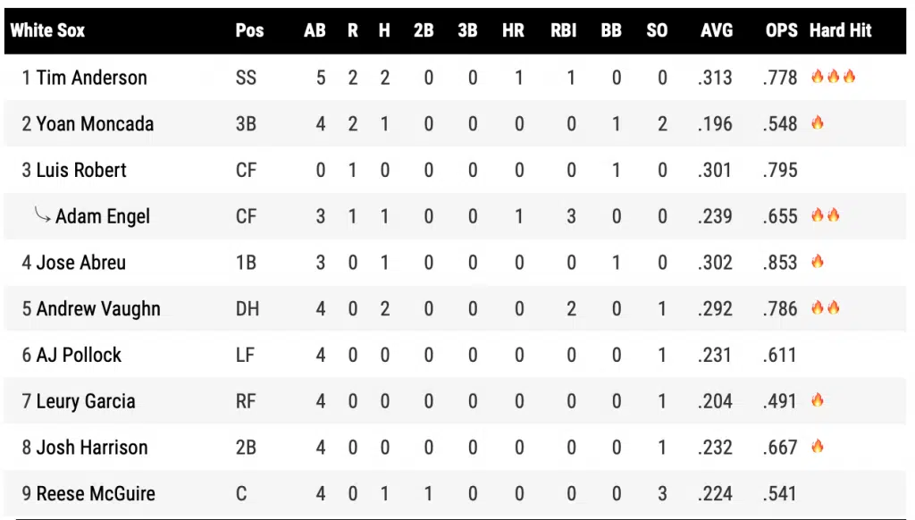 Engel came on in relief of Luis Robert, who left tonight’s game early with lightheadedness. He responded by hitting his first home run since May 15, a three-run homer that gave the White Sox huge insurance runs in a game that had been tight all evening.