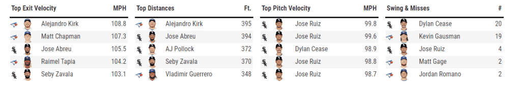 Cease was marvelous, as he carved up the Blue Jays’ strong lineup with 11 strikeouts over six shutout innings. He only permitted one infield single and two walks, and he also tied his career high in strikeouts with the 11 punch-outs, a number he has reached in seven starts. In a rollercoaster of a ballgame, the 13 runs in the box score don’t accurately reflect the superb pitching matchup between Cease and Kevin Gausman, with Cease getting the edge tonight. He lowered his season ERA to 2.68 in the sparkling effort, as his confidence and importance to this White Sox team both continue to grow.
