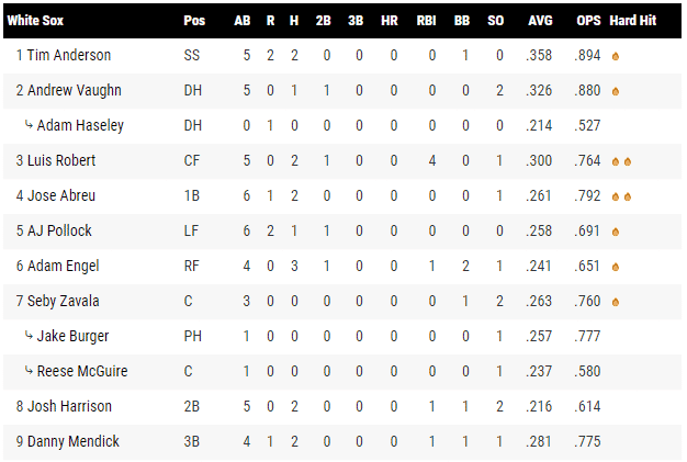 The Sox tallied 15 hits in tonight’s triumph, highlighted by multi-hit efforts from Tim Anderson, Luis Robert, Jose Abreu, Adam Engel, Josh Harrison, and Danny Mendick. The dynamic, five-tool star Luis Robert extended his hitting streak to 12 games, posting his fourth straight multi-hit game in the process. Look out folks, “La Pantera” is heating up with the weather.