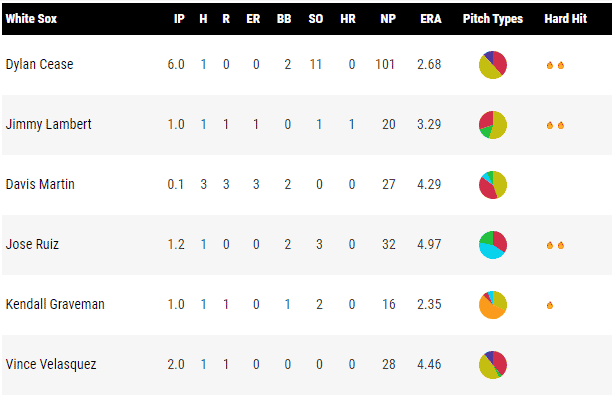Dylan Cease: 6.0 IP, 2 H, 2 BB, 0 ER, 11 K, 101 pitches (62 strikes)