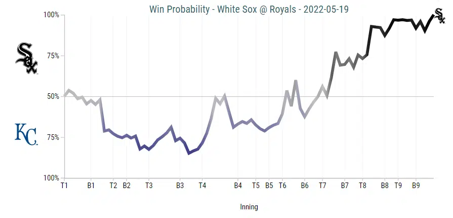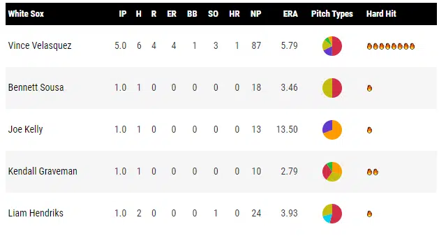 On the pitching side, Vince Velasquez got the start for the South Siders and did not have his best stuff this afternoon. He’s been solid in his past few starts, so I guess a stat line of giving up 4 ER in 5.0 IP should have been expected? VV only struck out three Royals, but managed to do so against one walk. However, it was enough to keep the White Sox in the ball game as the offense slowly climbed their way to the lead. Bennett Sousa pitched the 6th, Joe Kelly pitched the 7th, and Kendall Graveman pitched the 8th. All men did so without giving up a run, though oddly, none of them struck anyone out either.