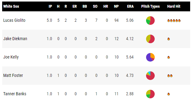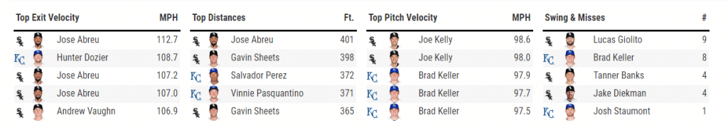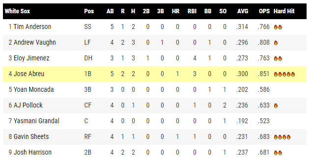 Eloy Jiménez and José Abreu were the catalysts in the big win, combining to drive in an eye-popping seven RBI in the contest. They weren’t the only big contributors on the night, though, as Tim Anderson, Andrew Vaughn, and Josh Harrison provided multi-hit efforts out of the 1, 2, and 9 slots in the order, respectively. The Sox pelted Keller for 13 hits, and the biggest one of them all was a José Abreu 2-run blast to left field (104.5 mph exit velocity). Abreu continues to smoke the ball; he had four batted balls that clocked in above 104 mph exit velocity in tonight’s game.