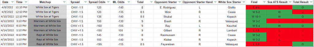 During this season, I’ll be tracking the White Sox gambling statistics to try to find interesting trends and data to help you all win some money! The Google Sheet can be viewed anytime at this link and has sortable columns so a user can look at various situations/scenarios to make informed bets.