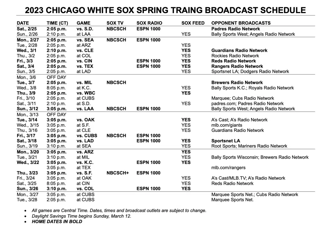 The White Sox, NBC Sports Chicago and ESPN Radio Chicago (AM-1000) have announced the team’s 2023 spring training television and radio schedule.