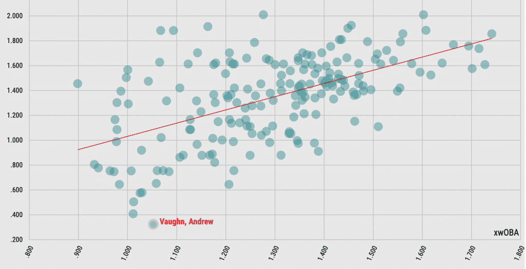 For the season, Vaughn has a .308 wOBA, which is an all-encompassing Statcast metric based on his batted ball data for which .317 is the league average. His xwOBA, a similar metric that shows what Vaughn’s wOBA would be in a perfect world where everybody got exactly what they deserved without any good or bad luck, is .332 (league average xwOBA is .312). Therefore, this 24 point discrepancy would suggest that Vaughn has been slightly unlucky this season. That lack of luck, however, becomes astounding when one views the data since August 16th.