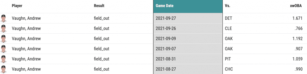 Vaughn has a 1.053 xwOBA over his nine barrels since August 16th. His actual wOBA on those barrels? .321. That computes to a .732 discrepancy, which is by far the largest of any player in baseball over this span (the next closest player is at .606). When one looks at Vaughn’s individual barreled balls, the overall bad luck becomes more clear. Vaughn’s last six barrels have been outs.